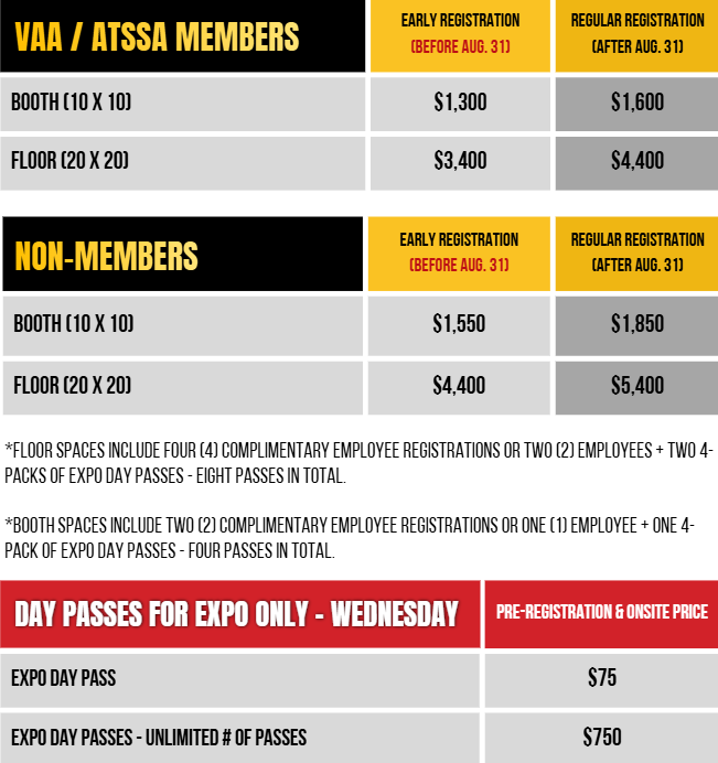 - Online Registration: Complete the online registration form below and submit payment for your booth or floor space(s) and any additional sponsorships, services, or expo passes selected. Submit the names and email addresses of all booth/floor space attendees. Ensure all required fields are filled out accurately, and mark that you have read and agree to the terms laid out in the expo’s rules and regulations document.